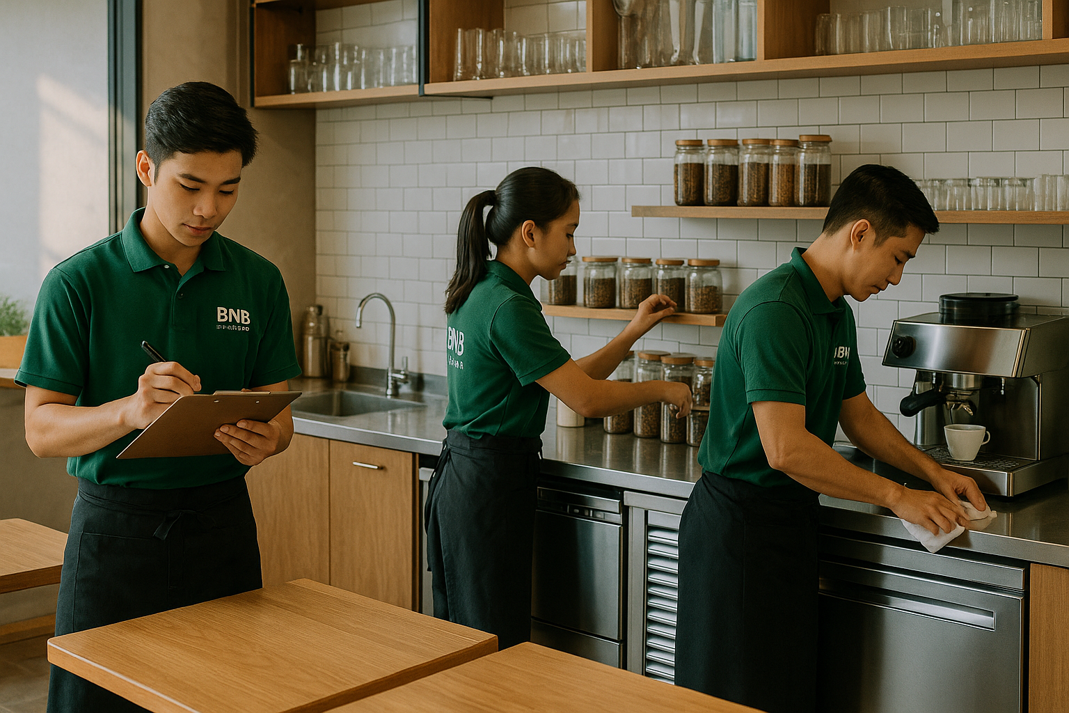 - Vệ sinh quầy bar, máy móc, khu vực khách, nhà vệ sinh.